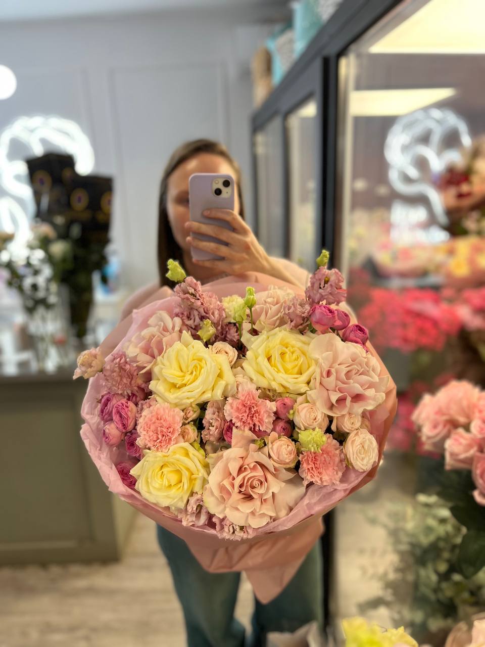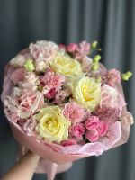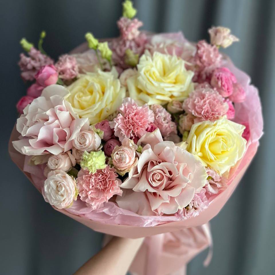 Этот букет — ода нежности. Воздушный и лёгкий, он словно соткан из утренней росы и первых лучей солнца. Мягкие, пастельные тона переливаются и плавно переходят друг в друга, создавая ощущение безмятежности и чистоты. Этот букет говорит на языке тёплых объятий, заботы и самых искренних чувств. Он — как тихое признание, произнесённое шёпотом.