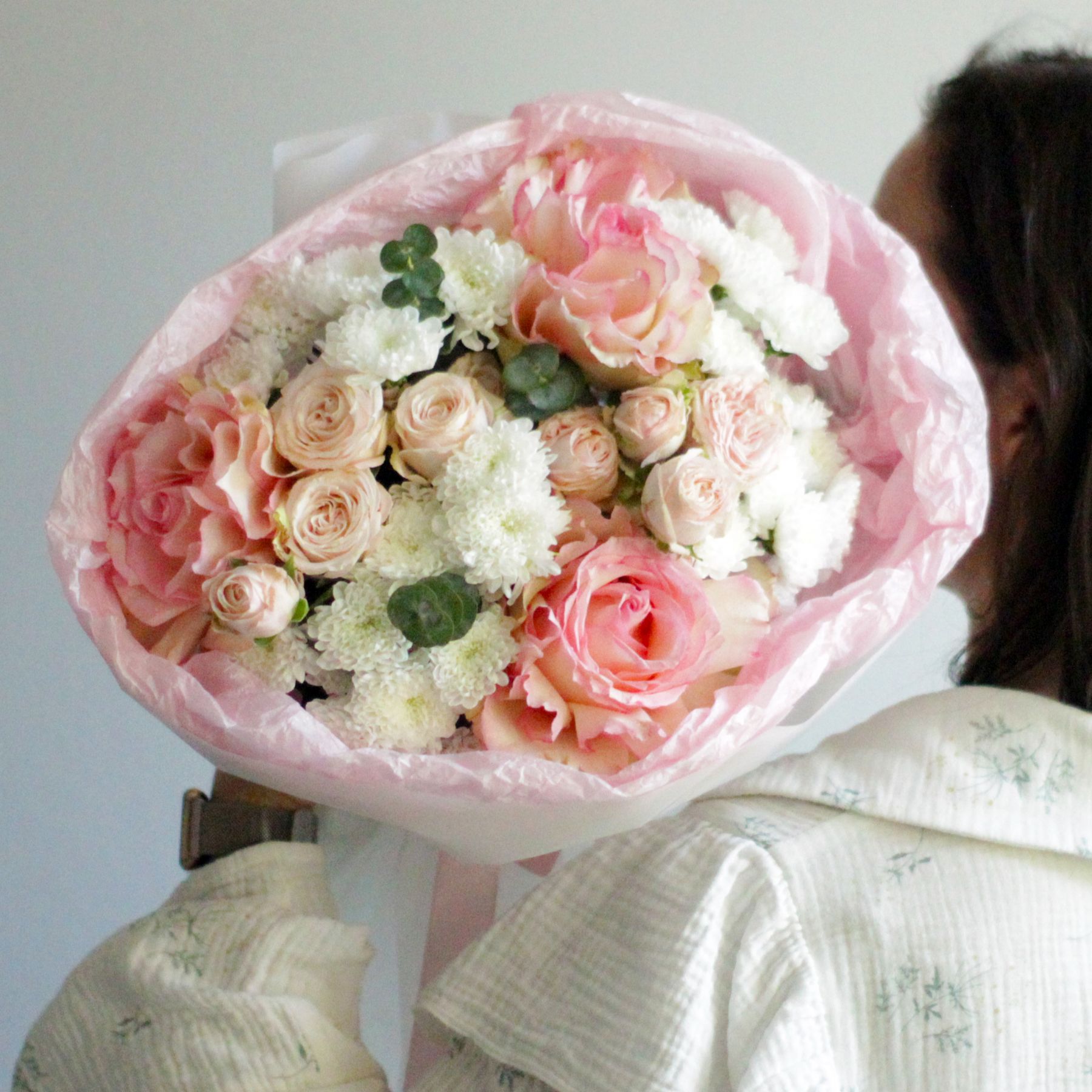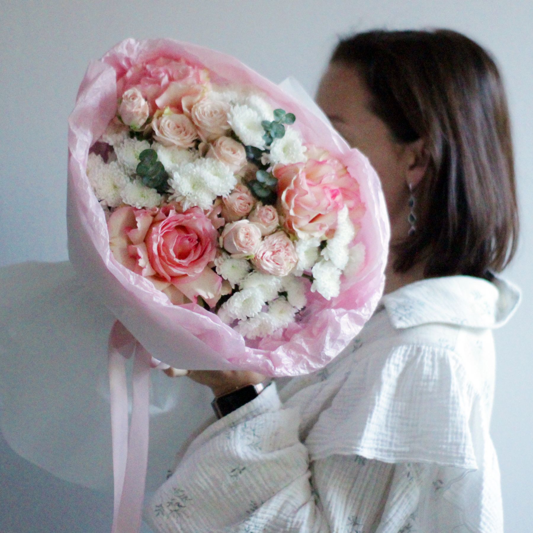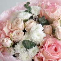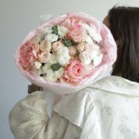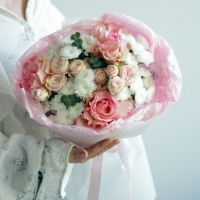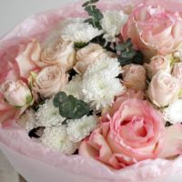 Букет из роз и хризантем сантини - это сочетание элегантности и утонченности, которое станет прекрасным подарком для любого случая.