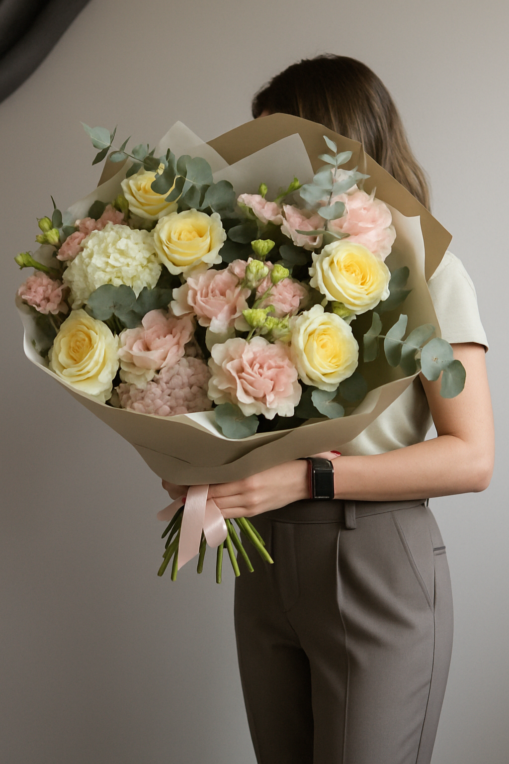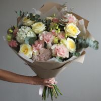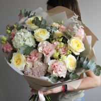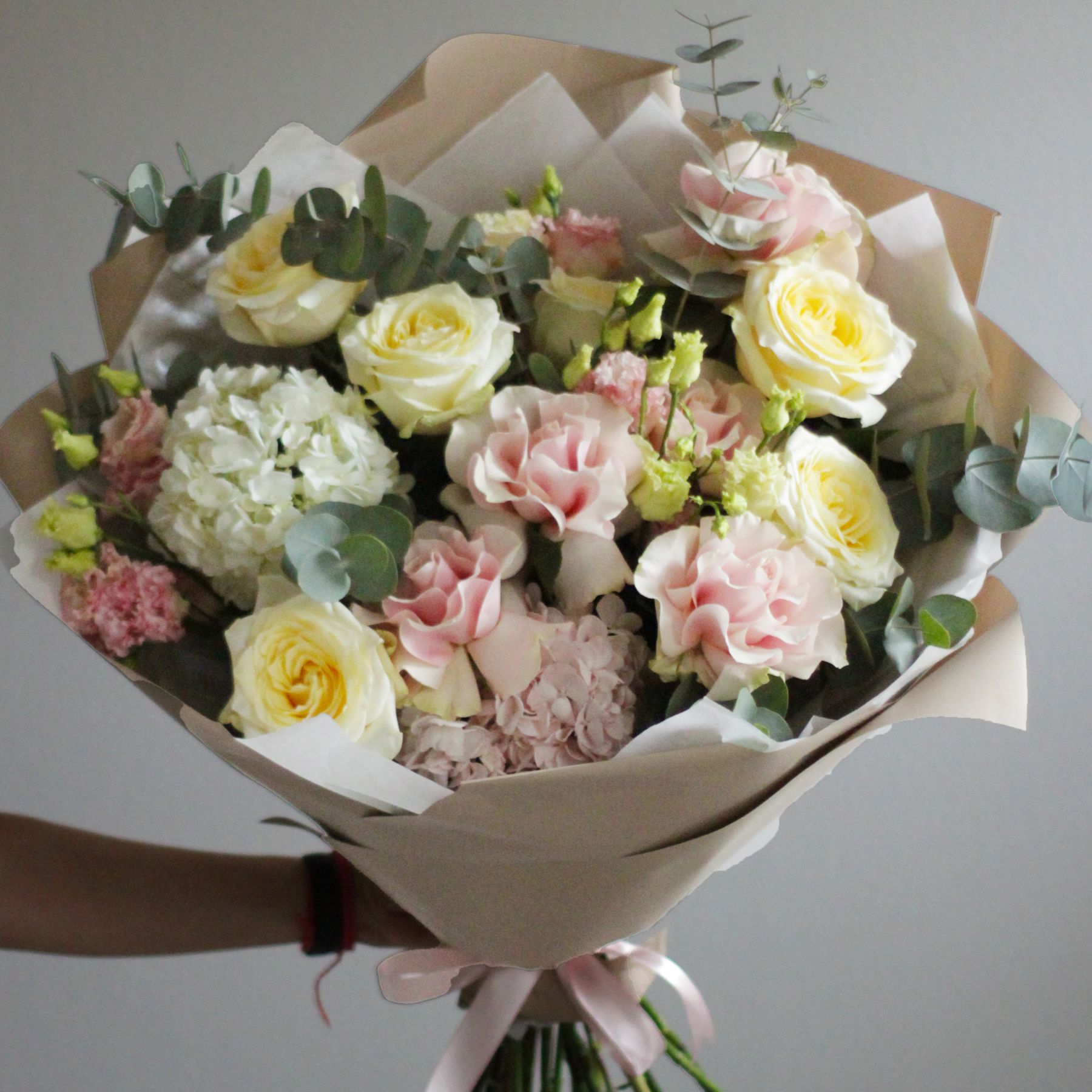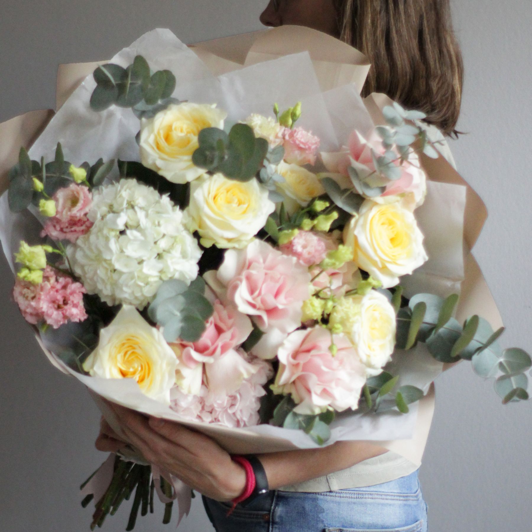 Объёмный букет для особого случая! Ароматные пионовидные розы, нежные оттенки и большой размер! Такой букет выглядит эффектно и, несомненно, произведёт впечатление!