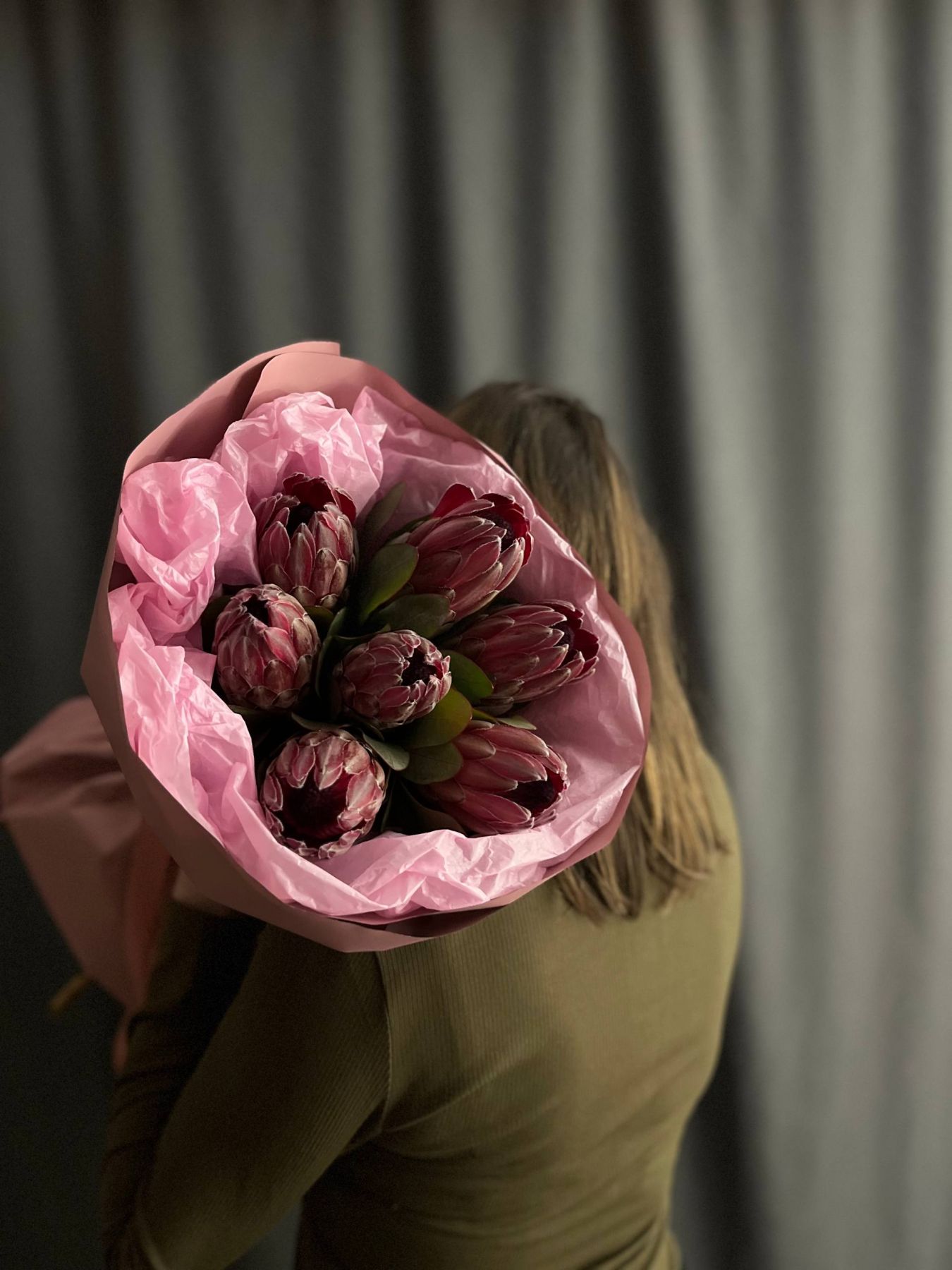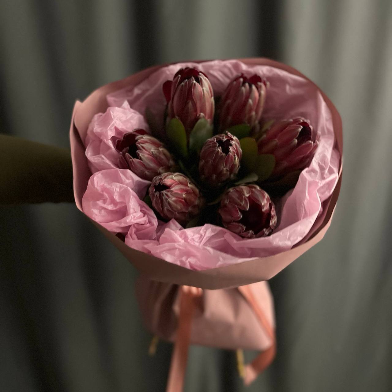 Экзотическая протея — звезда этого букета. Её графичные лепестки, похожие на корону, символизируют смелость, перемены и невероятную силу. Этот букет — не просто подарок, а яркое заявление, подчеркивающее уникальность того, кому он предназначен.